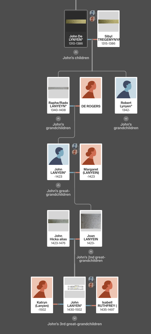 John Lanyen married Isabell Ruthfrey, daughter of Thomas. The name is variously spelt Ruthfrey, Rathrey and Ruthvey. Their son and heir Richard Lanyne was born abt. 1460.