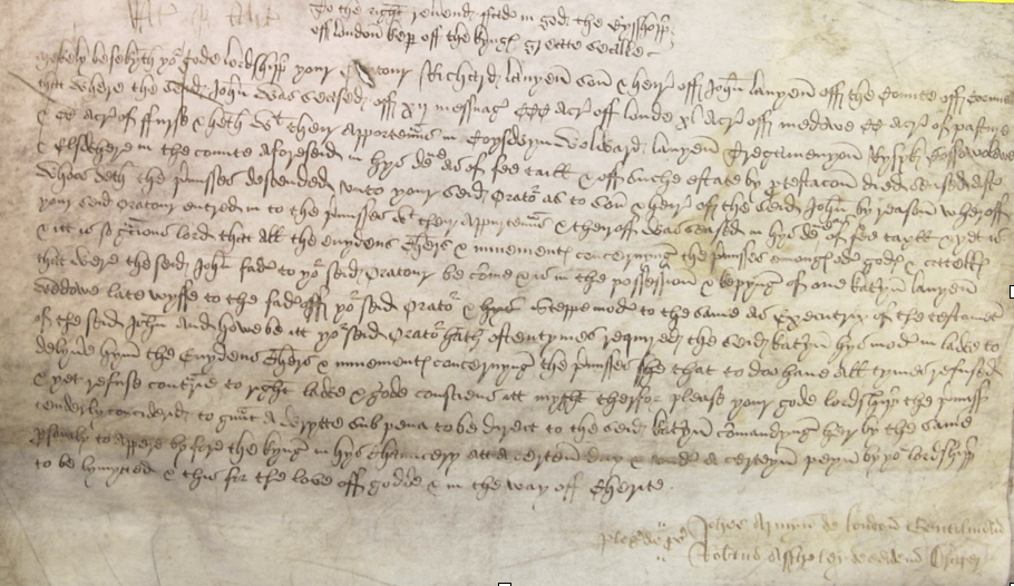 “Mekely besechyth your gode Lordshipp your oratour Richard Lanyen son and heir of John Lanyen of the Counte of Cornwall that where the seid John was seased of XII messuag CCC acre of londs XL acre of medowe CC acre of pasture CC acre of furze and heth with their appurtenances in Coswyn Wolward Lanyen Tregamenyan Rysyk Bossowolowe and elsewhere in the counte aforeseid in hys demesne as of fee tail and of such estate by ptestacon (protestation) died seased after whose deth the premisses descended unto your seid oratour as to son and heir of the seid John by reason whereof your seid oratour entred in to the premisses and their apputenances and thereof was seased in hys demesne as of fee tail and yet is and it is so gracious lord that all the evydens charters and munements concernyng the premisses that were the seid John fader to your seid oratour be come and in the possession and kepyng of one Katryn Lanyen Wedowe late wife to the fader of your seid oratour and steppe moder to the same and executryx of the testament of the seid John and howe be it your seid oratour hath oftentymes required the seid Katryn hys moder in lawe to delyver hym the evydens charters and munements concernyng the premisses and that to do has at all tymes refused and yet refuse contrarie to right lawe and gode constiens (conscience) as might thereof please your gode lordshipp the premiss tenderly considered to grant a derycte sub poena to be direct to the seid Katryn commandyng her by the same personaly to appear by fore the Kyng in hys chauncery at a certen day and under a certeyn payn by your lordshipp to be lymytted and this for the love of godde and in the way of charitie.”