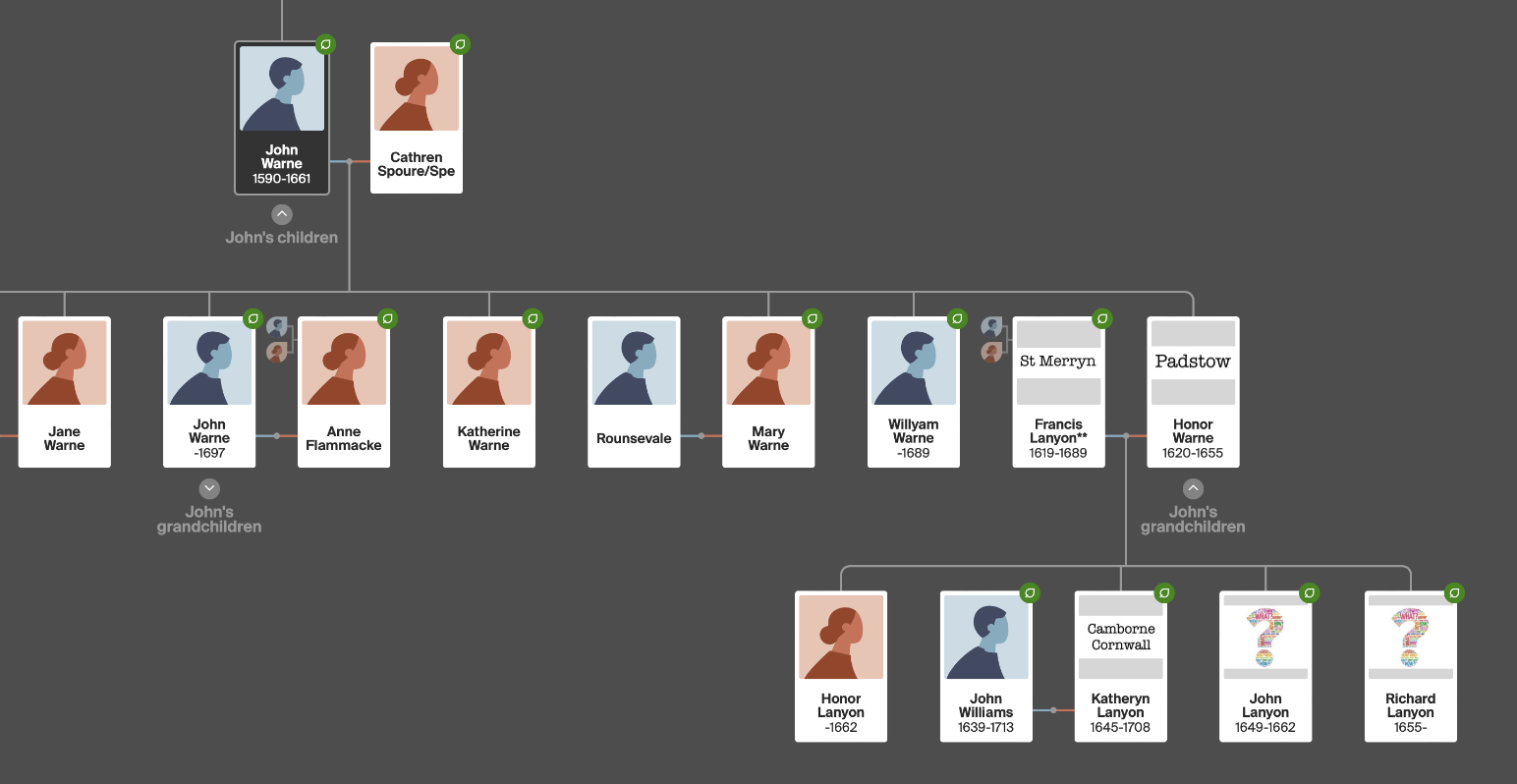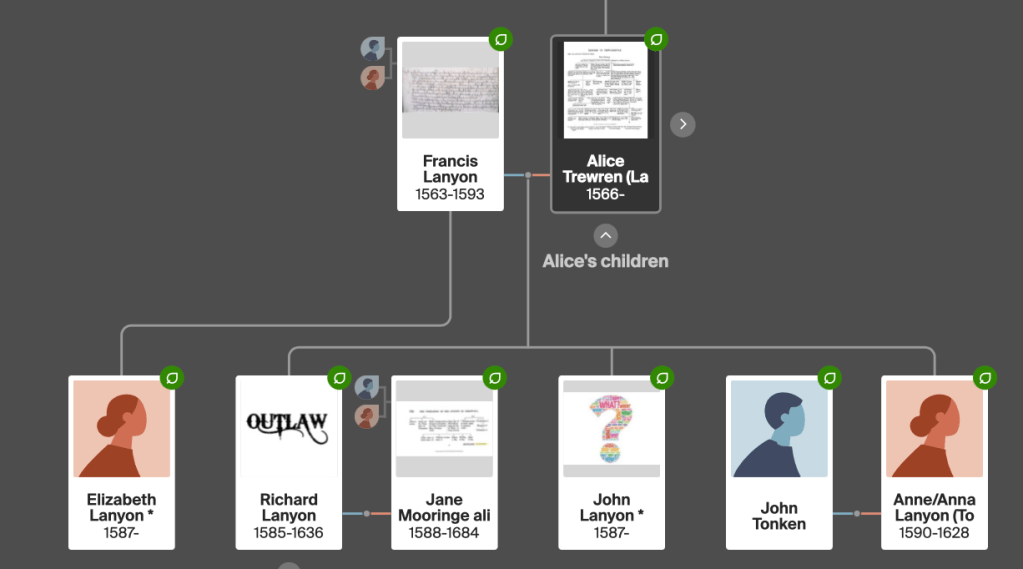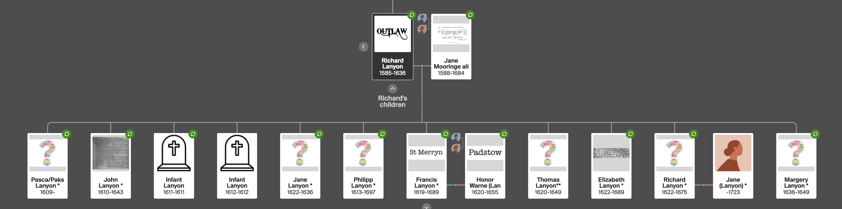 A Katheryn Lanyon married John Williams at Camborne in 1668. Katheryn Williams may be Francis Lanyon’s daughter. There is no further trace of Honor, John or Richard. There are probably descendants of this line but it’s not possible to prove that.