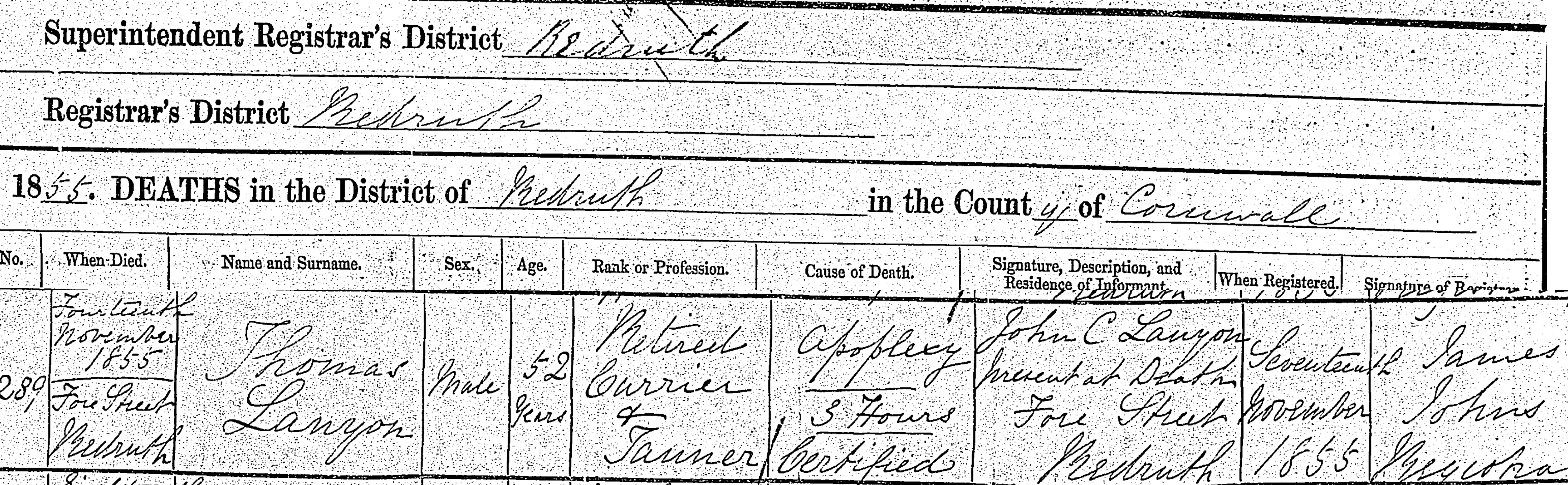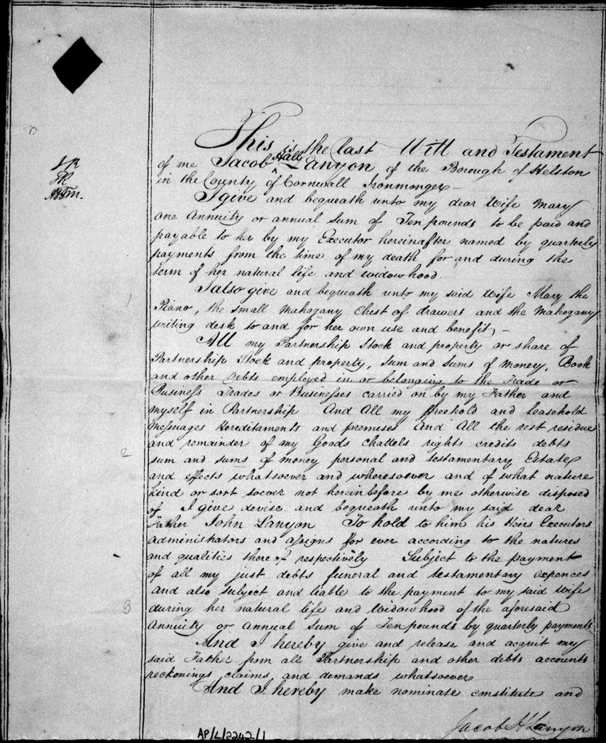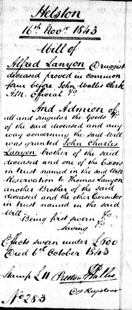 John was born in 1769 in Helston the son of Charles Francis Lanyon and like his four brothers he was a cordwainer and currier however he also diversified into ironmongery. When he died in 1835 after “a very long affliction” his estate was worth £4000.