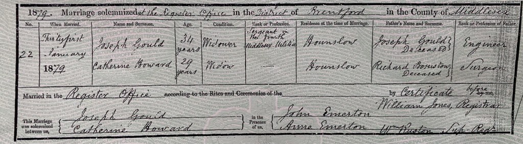 On 31 Jan 1879 Catherine remarried in Brentford Middlesex to Sergeant Joseph Lionel Gould, it’s not clear if she was actually divorced at the time! The marriage certificate describes her as a widow!