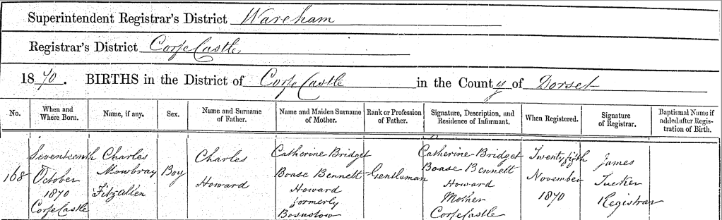 Charles Mowbray Fitzallen Howard was born on 17 Oct 1870 at Corfe Castle, Dorset. This is the second time Temple has been associated with Dorset, his first son and daughter were also baptised at Dorchester in Dorset. The birth is registered by Catherine ‘Howard’ and father’s profession is listed as ‘gentleman’.