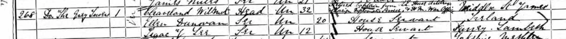 He’s listed as Cleaveland Wilmot age 32 (born about 1829) living at The Grey Towers Kingston Upon Thames. Born St James Middlesex and employing two servants. His occupation was listed as Retired Captain from Horse Artillery and ‘foreign’(?) Diplomatic service and HM War Office. (It appears as though he has been promoted!!)