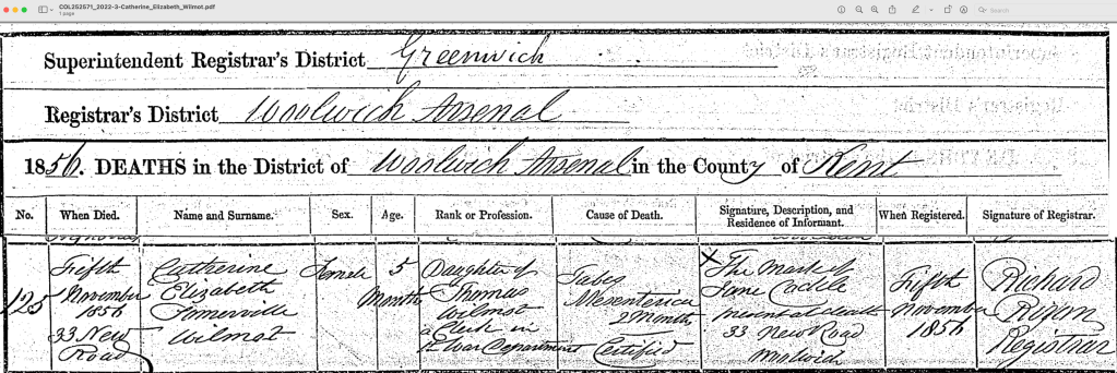 On 5 Nov 1856, at Woolwich Arsenal Greenwich London, Catherine died. Father is listed as Thomas Wilmot, clerk in the war office, and they were living at 33 New Road. Cause of death was Tabes Mesenterica, a form of TB which can occur if an infant is fed cow’s milk. The death was registered by a Jane Cockle who was present. Jane Cockle was a neighbour, she was married to Francis and can be found on the census from 1841 – 1871.