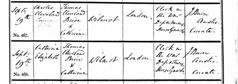 Charles Cleveland (with a faint third name which looks like Summerfield) and his sister Catherine Elizabeth. Father was described as ‘Clerk in the War Department Horse Guards’ and their residence is London. I could not find any trace of a marriage between Thomas Wilmot and Catherine before 1856.