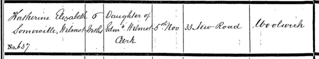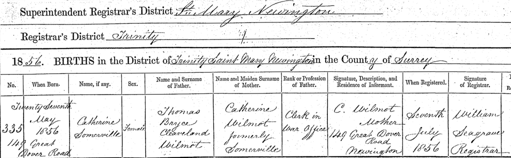 I couldn’t find a birth entry for Catherine Elizabeth but I did find a relevant entry for a Catherine Somerville born 27 May 1856 father’s name Thomas Bryce Cleaveland Wilmot a clerk in the war office.