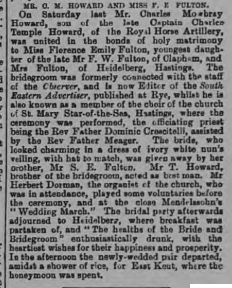 On 17 Jun 1893 Charles Mowbray Fitzallen Howard married Florence Ethel Fulton. Their marriage announcement describes his father as “The Late Captain Charles Temple Howard of the Royal Horse Artillery” but that’s not true, he’s still very much alive and in Holloway prison!