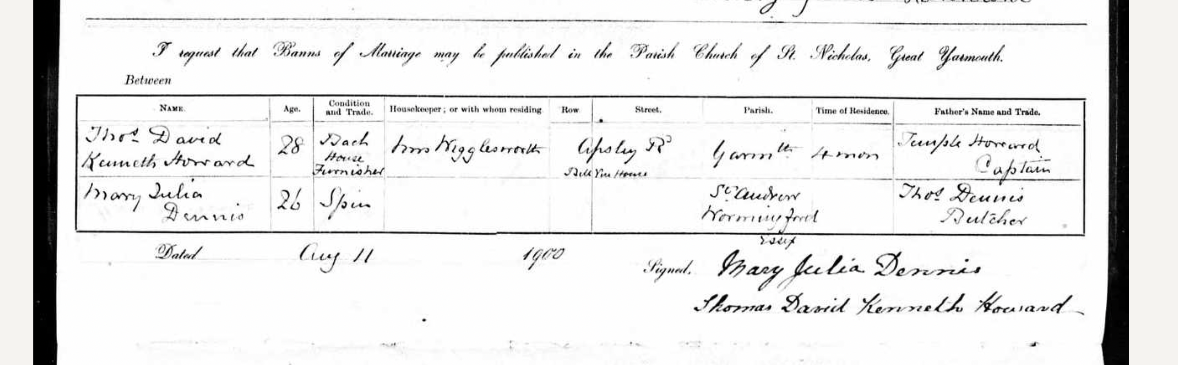 Charles’ brother Thomas David Kenneth Howard married Mary Julia Dennis on 22nd Sep 1900 at Lexden in Essex. His father is recorded as Captain Temple Howard on the entry in the register.
