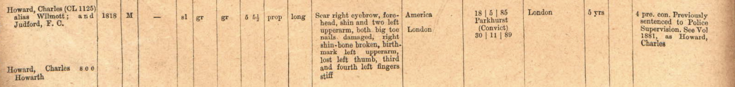 On 3 Nov 1881 Temple Wilmot/Charles Howard was released from prison and then further jailed for a month for failure to report for police supervision.