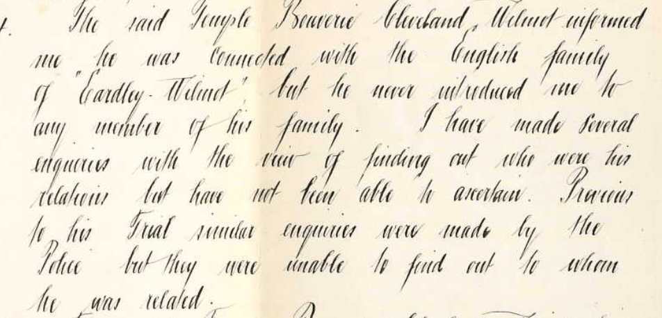 Catherine stated “The said Temple Bouverie Cleveland Wilmot informed me he was connected with the English family of Eardley Wilmot but he never introduced me to any member of his family. I have made several enquiries with the view of finding out who were his relations but have not been able to ascertain. Previous to his trial similar enquiries were made by the police but they were unable to find out to whom he was related.”