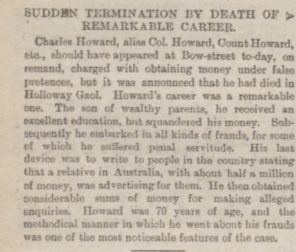 Charles Howard 58 (born about 1827) a retired Captain ‘with property In Italy’ conned several people into sending him money by postal orders telling them they were potential heirs to a deceased American millionaire and were in line to inherit £3000.’ (I think Charles would have loved the internet!)