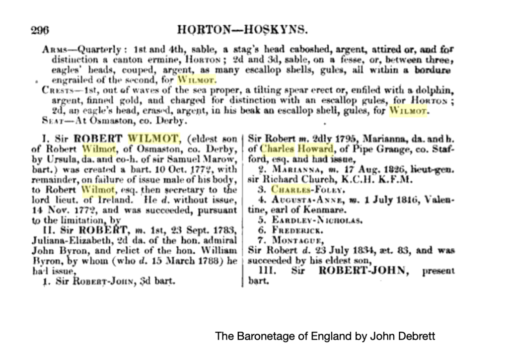 Eardley Nicholas Wilmot (1752-1834) was the son of Sir Robert Eardley Wilmot, 2nd Baronet of Osmaston Hall in Derby. Sir Robert Wilmot was married to Mariana Howard, the heiress of Charles Howard of Stafford (1742-1791). The chance of a family having the names Wilmot, Charles and Howard seems to be too much of a coincidence.