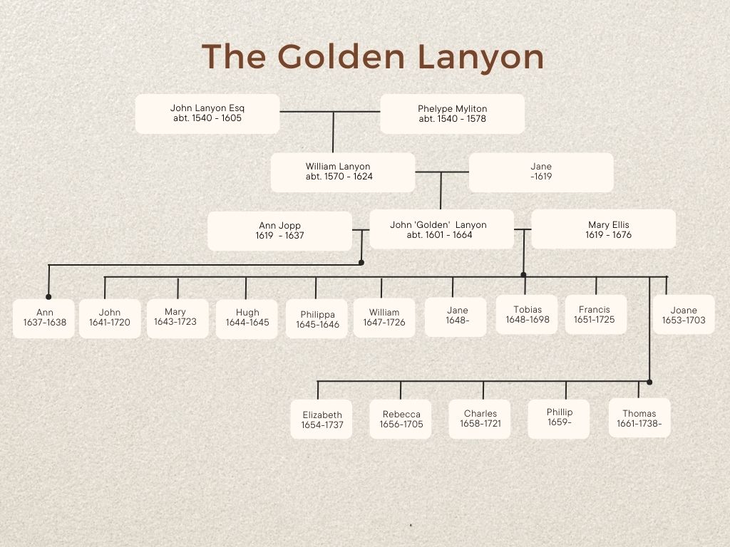 John ‘Golden’ Lanyon’s baptism wasn’t recorded but he must have been born after the death of his elder brother in 1601 and before his brother William in 1603.