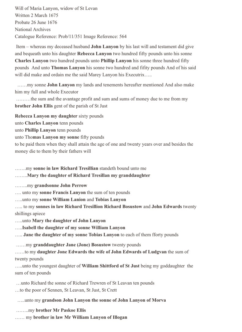 - Item I doe give and bequeath to my sonne William Lamon All my Estate in Bottreth and in Bossence and in Deanerall Chegwine vean Treronacke and Treronacke Mill and Lanes and Mannen within the parish of St Crett Lease and Fee And all my Estate of the houses and Land that I Did buy of Thomas Chergwine of Penzance And the Fee land that I did buy of David Graffe being the land that Mrs Margery Rogers hath a Lease of it in Penzance And the One halfe of all my houshould goods And the One halfe of all my Tynn Bounds And Two Hundred pounds in money