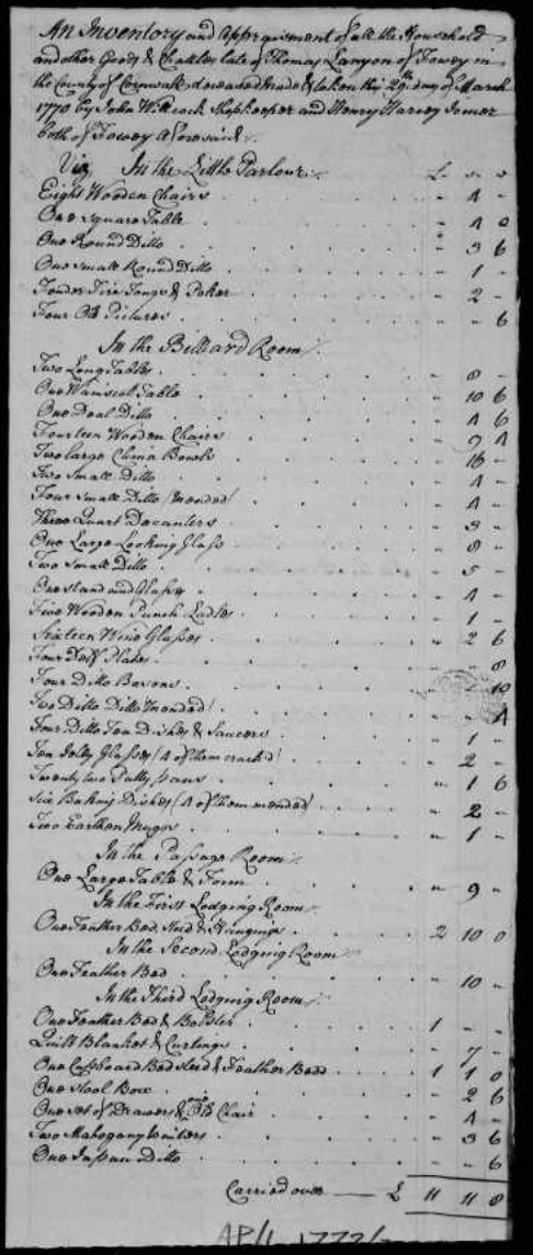 Thomas died in 1770 and left a wonderfully detailed inventory of goods which gives a real glimpse into their lives. The will describes the furnishings in each room.