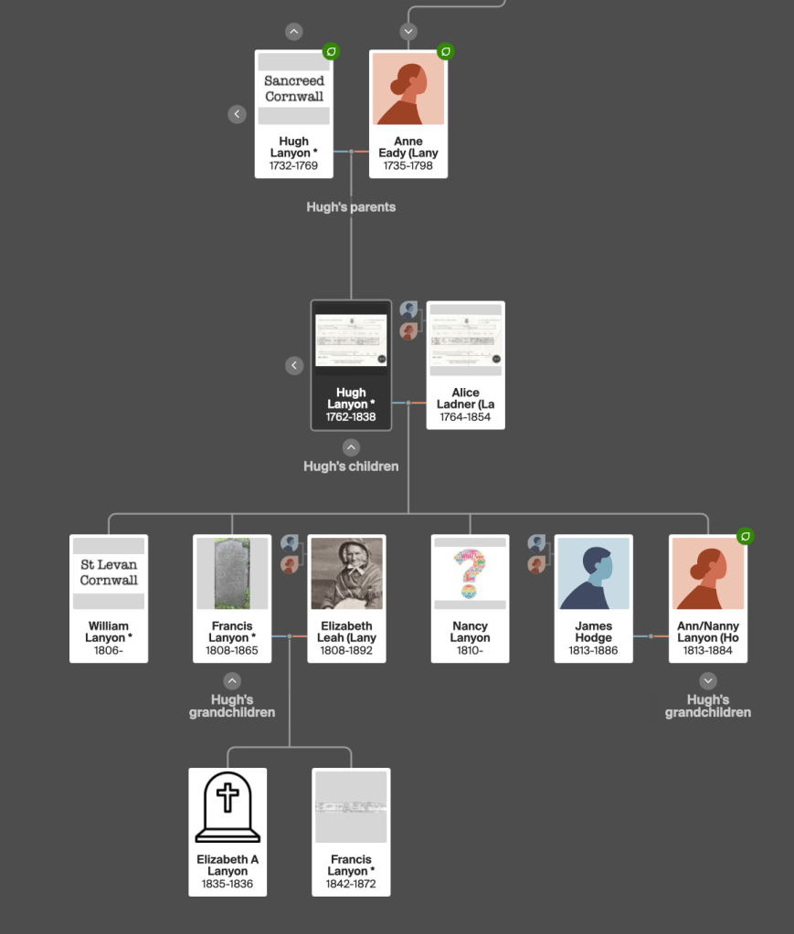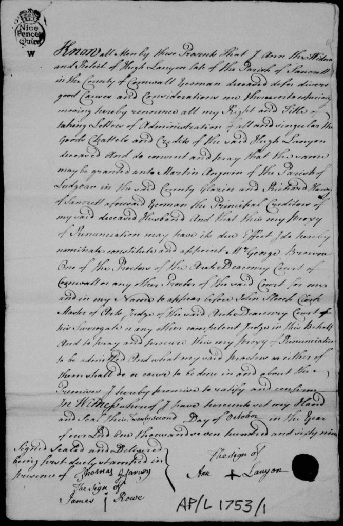 Hugh was baptised at Zennor in 1732. In 1762 he married Anne Eady at Sancreed and they had two sons, Hugh and Ralph. Hugh senior was a yeoman which meant he owned some land. Hugh died in 1769 when his youngest son was just two. He died intestate and his wife renounced administering his estate to Martyn Angwin, Richard Harvey and William Lanyon 1725-1770 (her brother-in-law) his principal creditors.