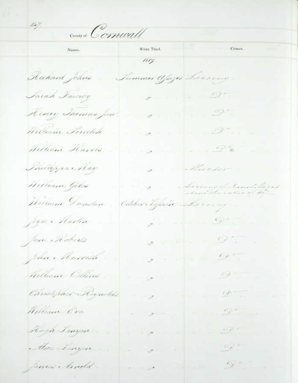 He was described as 5’2″, dark hair, dark eyes and a dark complexion. Unable to read or write. Freckled, thick lips, scar on nose and left wrist, large eyebrows and slightly pock marked. He was already working as a labourer at Penzance. His weight on entering prison was 133lbs and 3 weeks later it has fallen to 129lbs. Bodmin Gaol was tough. (Source AD/1676/4/5).
