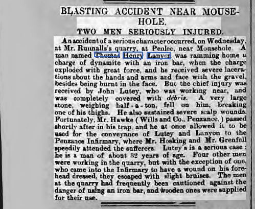 Thomas was also seriously injured in a mining accident. Mining was a dangerous occupation but often it was all that was available.