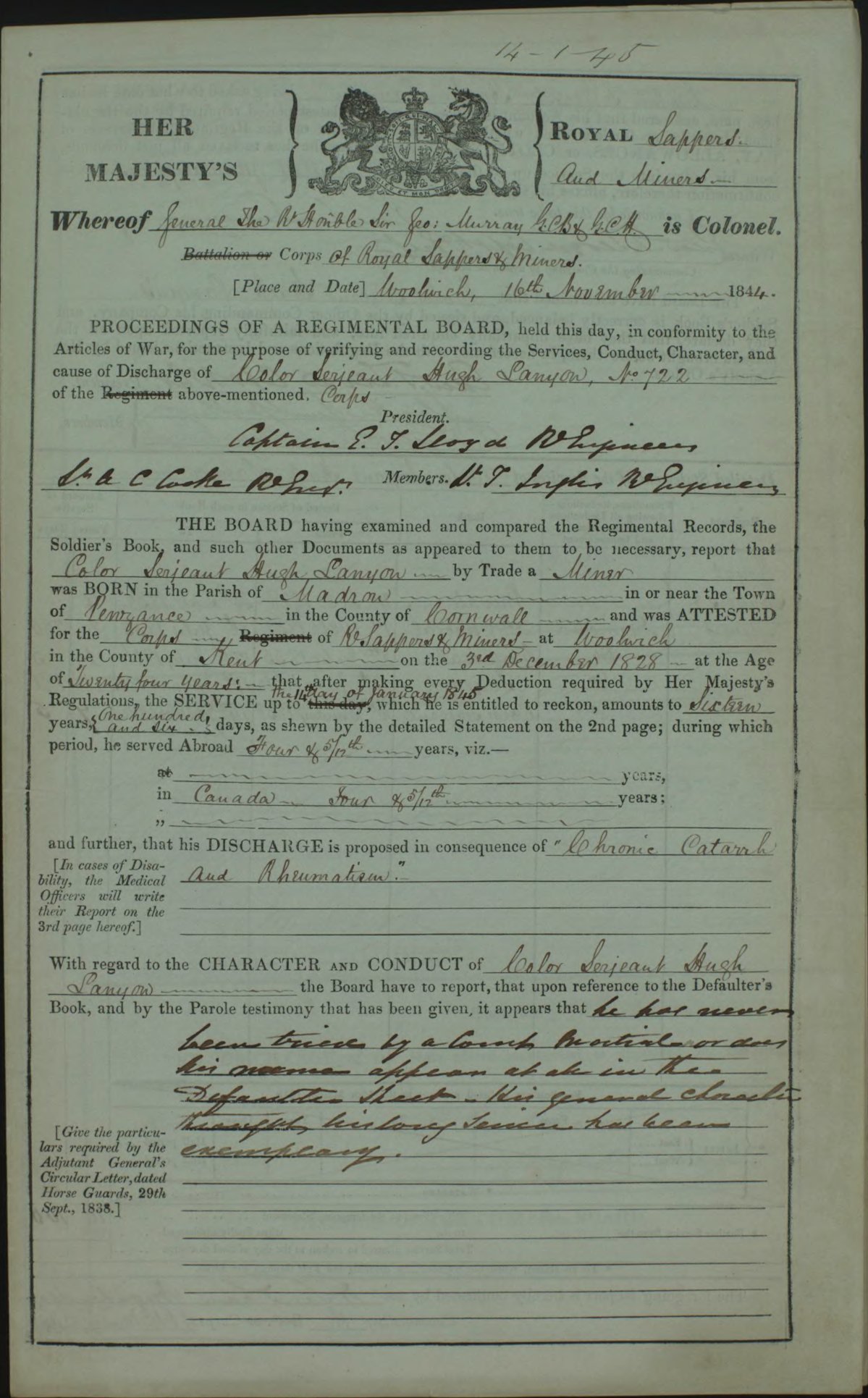 Age 24 Hugh enlisted in the army. He was a Colour Sergeant in the Royal Sappers & Miners. While bound for Vera Cruz in the ship ‘Cambria’ he helped rescue 551 of the passengers and crew of the ‘Kent’ an East India ship which caught fire in the Bay of Biscay in Feb 1825. Connolly, in his ‘History of the Royal Sappers and Miners’ p309, writes of him ‘Sergeant Hugh Lanyon, after Sergeant – Major Forbes’ removal, was appointed to the charge of the detachment at Sandhurst College, and carried on the file details in every way to the satisfaction of the authorities. For many years, as a private and non-commissioned officer, he worked at the College, and his example had the best effect on the successive parties with which he served. As a practical sapper he was one of the ablest and most skilful in the corps, and in the rapidity with which he threw up earth works was unsurpassed. Sir Charles Pasley has done him the honour by noticing the extraordinary labours of the sergeant in his ‘Practical Operations for a Siege’. His willing ness and ability in this respect covered, in great measure, his educational deficiencies. In charge of the detachment he displayed his usual industry and exertion, kept his men in perfect discipline and order… so effectively were all the instructions carried out, that the governor of the college, with the sanction of the Master-General, presented him in November (1837) with a case of drawing instruments bearing an inscription ‘flattering to his zeal and services.’ Shortly afterwards he was promoted to colour-sergeant and served in Canada during the rebellion. Somewhat broken in health he was discharged in 1844 and became a surveyor on the Trent and Mersey Canal, working under James Forbes. He died in 1846 at Lawton in Cheshire. He was a ‘remarkable man with rather more brawn than brain one suspects‘ (P.A Lanyon-Orgill). Connolly recounts a story about him while building a stockade at Mississawra in Canada in 1842; ‘six men complained to him of the heavy task they were subjected to in removing timbers about 15 feet long and 12 inches square….Lanyon made no observation, but shouldered one of the unweildy logs and, to the amazement of the grumblers, carried it to the spot unassisted.’ In 1843 he was in Ireland and was sent to explore a sewer running into the Liffe river which might provide a means of entry into Dublin Castle. ‘He did so and found that a strong iron grating existed in the passage, which would effectually prevent the supposed entrance. In this duty, being much exposed to the influence of noxious vapours, he soon afterwards was seized with fever and jaundice, which shortened his days.’ (Connolly). He never married or had any children.