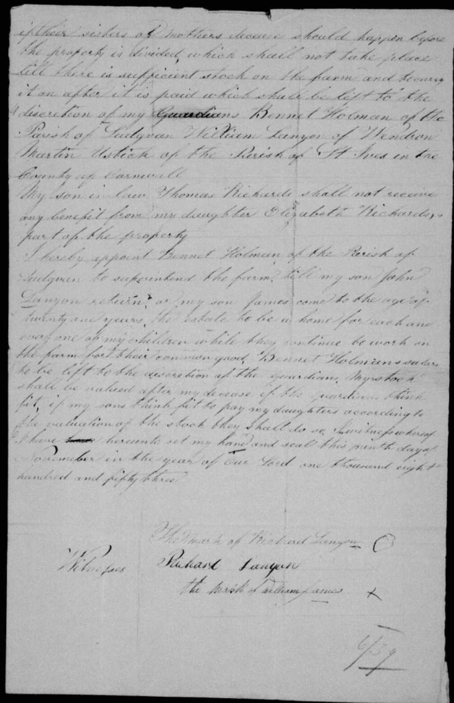 Richard died in 1853 and his will specifically excluded his son in law Thomas Richards. “Thomas Richards shall not receive any benefit from my daughter Elizabeth Richard’s part”.