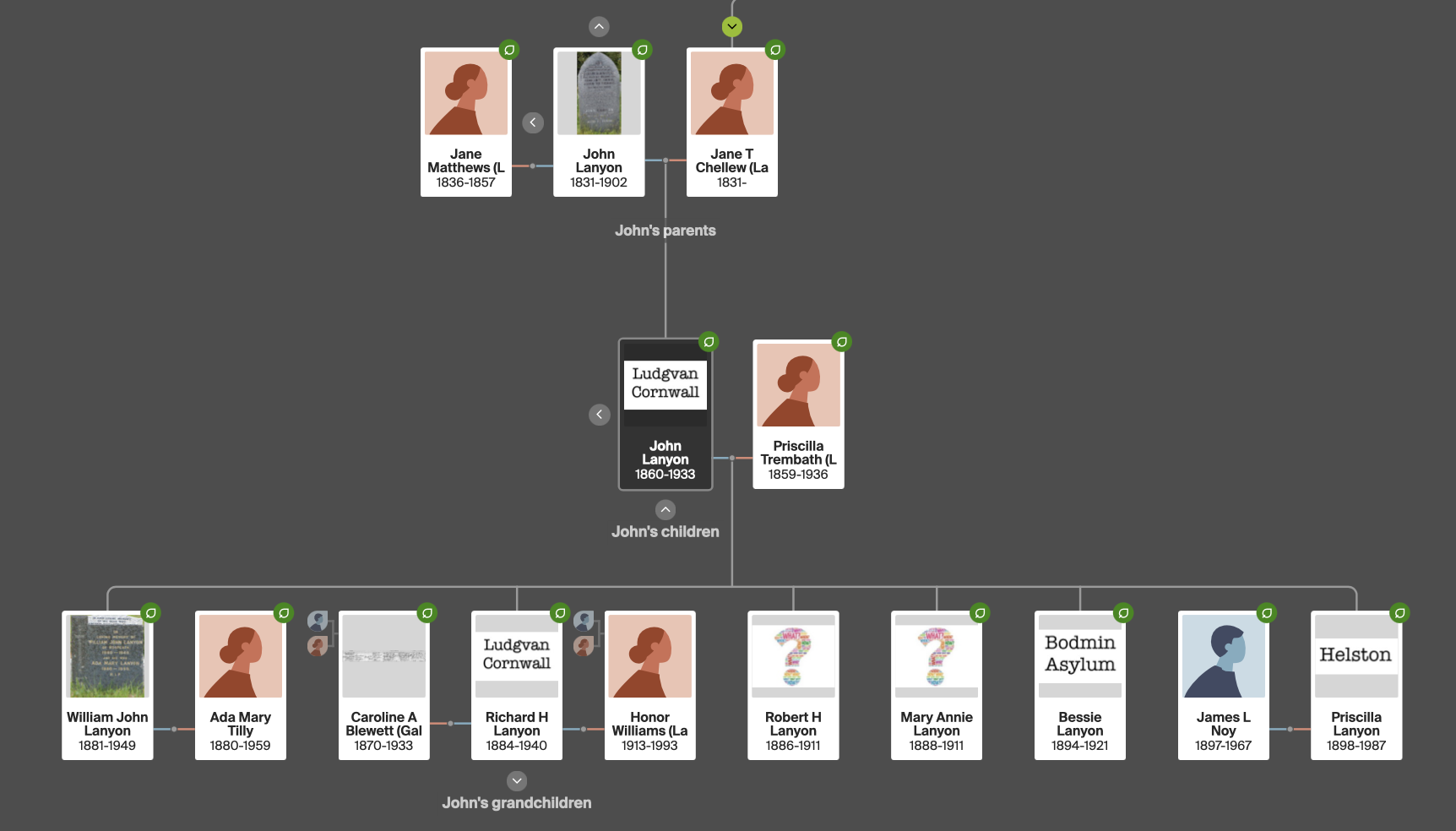 • William Argell Perrow Lanyon 1808-1884 was a farmer, he never married but lived with his illegitimate son, Alfred Lanyon, who was born about 1856. No further trace of Alfred.