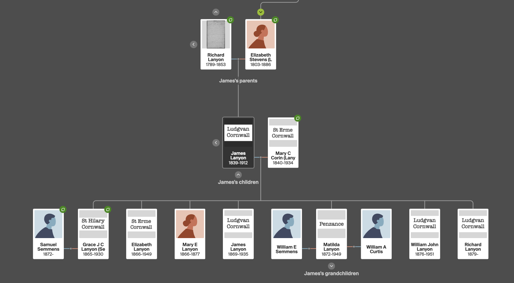 James was the son of Richard Lanyon and Elizabeth Stevens. He worked as a farmer and a miner. In 1863 he married Mary Carlyon Corin at Ludgvan and they had seven children.