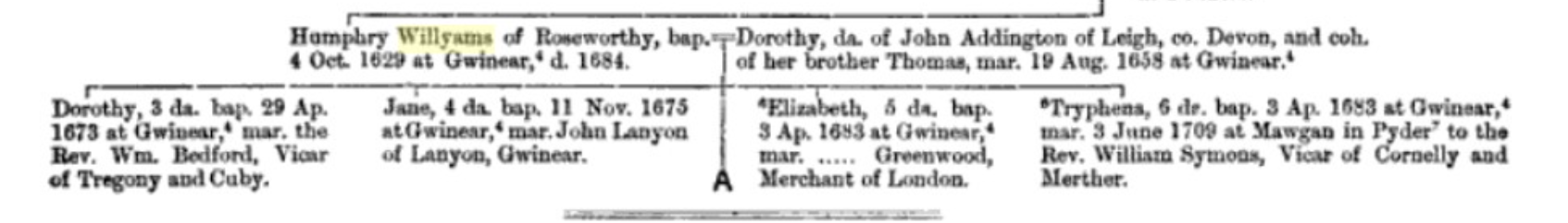 Jane is shown as the daughter of Humphry Willyams of Roseworthy and Dorothy Addington of Devon. Jane was baptised 11 Nov 1675 at Gwinear and married John Lanyon of Lanyon Gwinear.