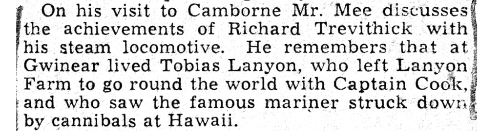 ‘Jane b. in November 1765 m. to John Lanyon of Lanyon in Gwinear, grandfather of lieutenant William Lanyon R.N., well known for his various acts of heroism and benevolence in his profession, the last survivor of those gallant officers who accompanied Captain Cook in his voyages. Twice he circumnavigated the globe with that distinguished commander and was with him at the period of his melancholy end.’