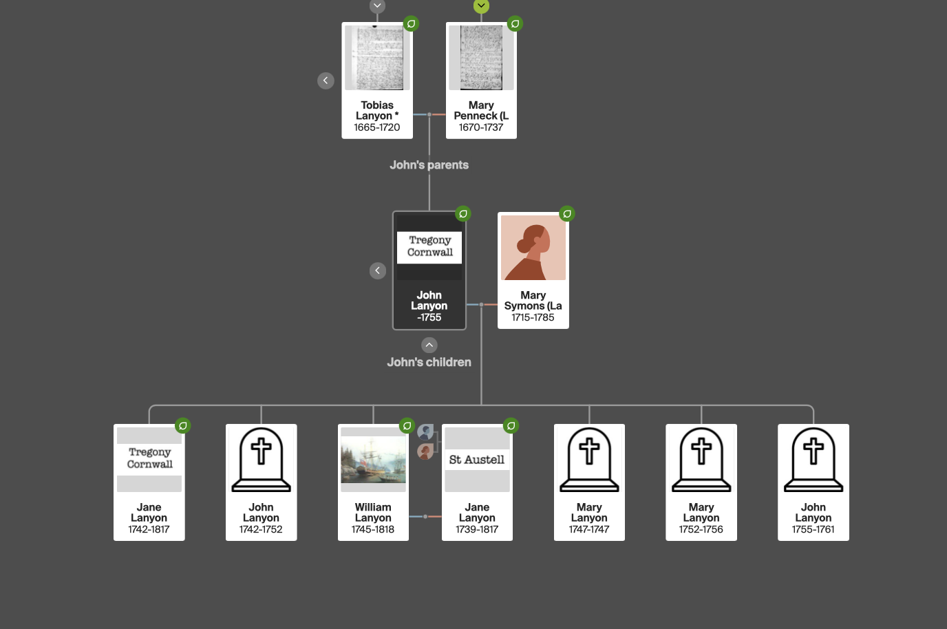 There is a baptism of William Lanyon son of Mr. John Lanyon and Mary on 2 Apr 1745 at Cuby with Tregony. They have three other children baptised there: Mary 1747, Mary 1752 and John 1755. Of their children, only William survived to adulthood.