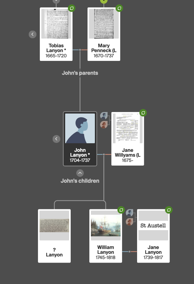 Assuming John was a similar age to Jane we are looking for a John born in the 1670s who lived at Lanyon Manor in Gwinear. This would probably be a child of Tobias Lanyon and Susannah Reynolds but they don’t have a child called John and don’t mention a son of that name in their wills. Tobias and Susannah’s son Tobias does have a son called John however he must have been born after 1703 and would be at least twenty-eight years younger than Jane Willyams!