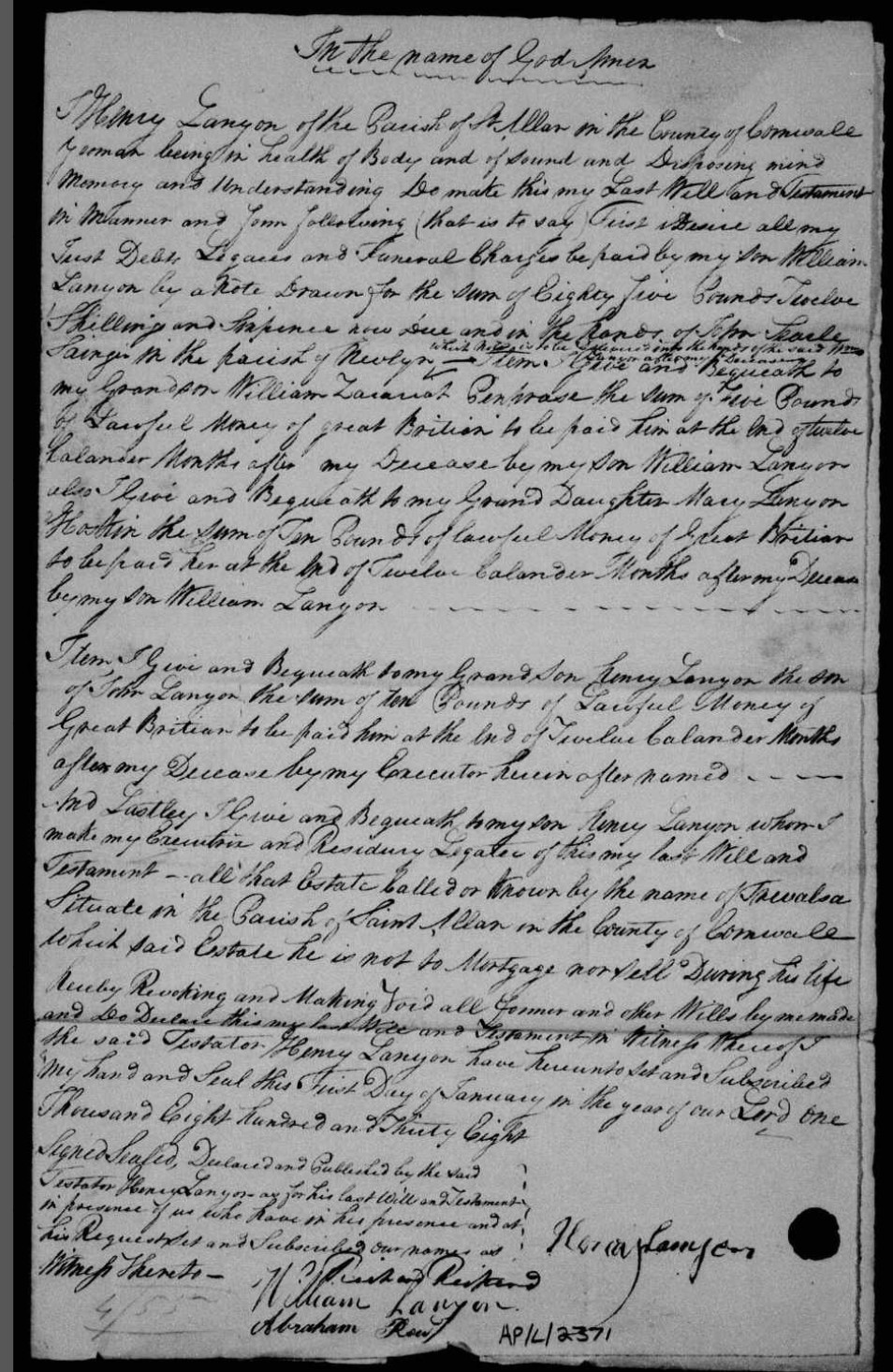 - To my son Henry Lanyon, executor and residuary legatee of estate called Trevalsa in Par, St Allen