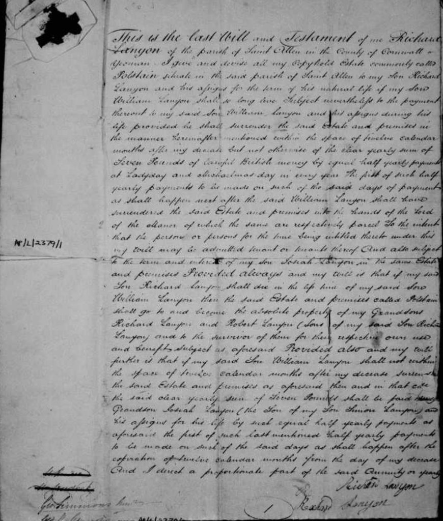 - I give estate called Polstein in Par St Allen to my son Richard Lanyon and his assigns for his natural life if my son William Lanyon shall so long live subject nevertheless to payment thereout to my said son William Lanyon providing he shall surrender said estate and premises in manner hereinafter mentioned….after William shall have surrendered said estate into hands of the Lord of the Manor of which same are respectively parcel….subject to the term and interest of my son Josiah.