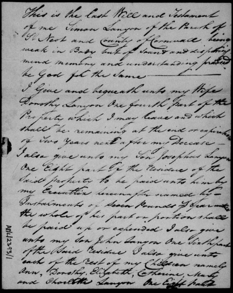 Simon was baptised at St Allen in 1785 and married Dorothy Hoskins there in 1810. He died at St Neot, Cornwall on 26th Dec 1839 aged 52. His will described him as a yeoman of St Neot. They had eleven children: