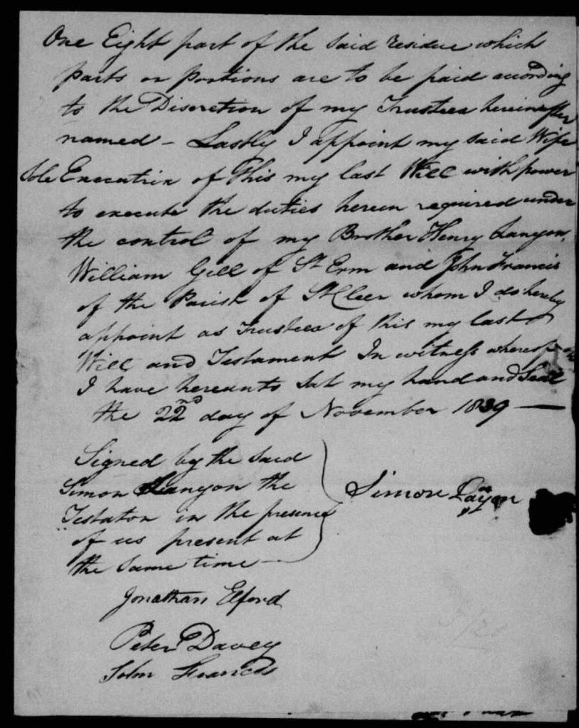 - My wife sole executrix with power to execute the sureties herein required under the control of my brother Henry Lanyon, William Gill of Erme and John Francis of Par, St Cleer whom I appoint as trustees