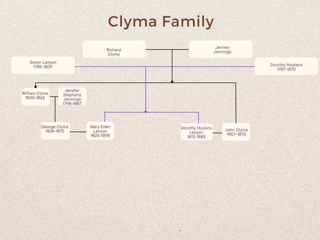Mary Ellen Lanyon and her sister Dorothy Hoskins Lanyon (the daughters of Simon Lanyon and Dorothy Hoskins) married an uncle and nephew. Dorothy married John Clyma and Mary Ellen married his nephew George Clyma.