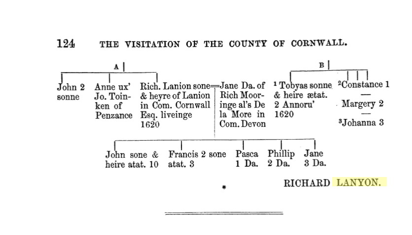 Richard Lanyon Esq’s will of 1636 left all his daughters £30 or £40 apart from Pasca who received 5 shillings which implies that in 1636 she was already married and had received her ‘portion’. Sadly the will does not mention her married name.