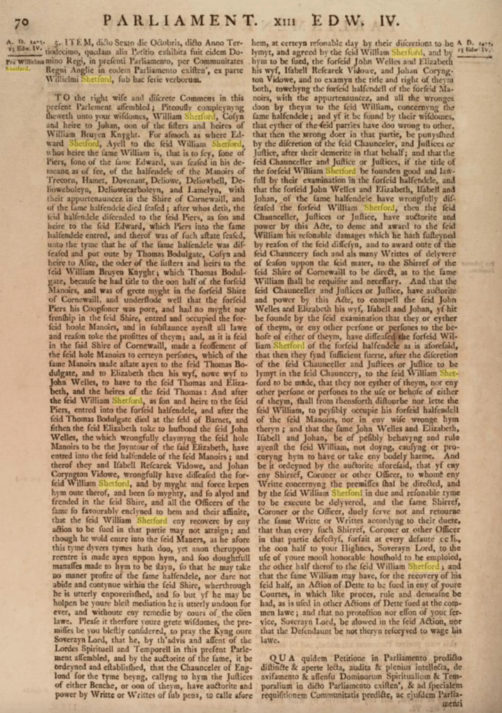 The Shetford/Shutford (and occasionally Shitford!) family originally came from Somerset. They were cheated out of a half share in six manors in Cornwall by Sir Thomas Bodulgate during the Wars of the Roses.