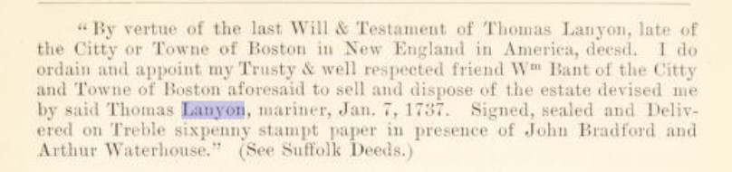 Thomas was baptised at St Hilary in 1697 and may be the Thomas Lanyon, mariner, of Boston, America who died on 7 Jan 1737. (Source ‘Brondson & Box Families Part 1’ by Lucius B Marsh.) Charles Lanyon merchant of Penzance was given power of attorney to sell his estate.