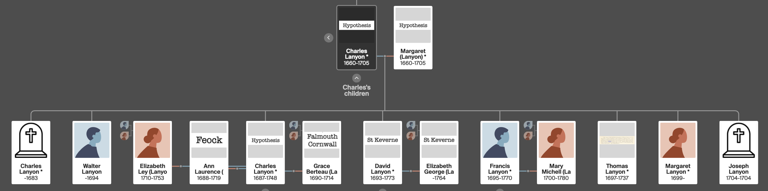 Initially I thought this Charles might have married Eleanor Nines at Perranuthoe in 1715 and couldn’t trace any children. Then I had a breakthrough. This Charles is likely the Charles Lanyon who married Grace Berteau at Falmouth in 1709. They had one son: