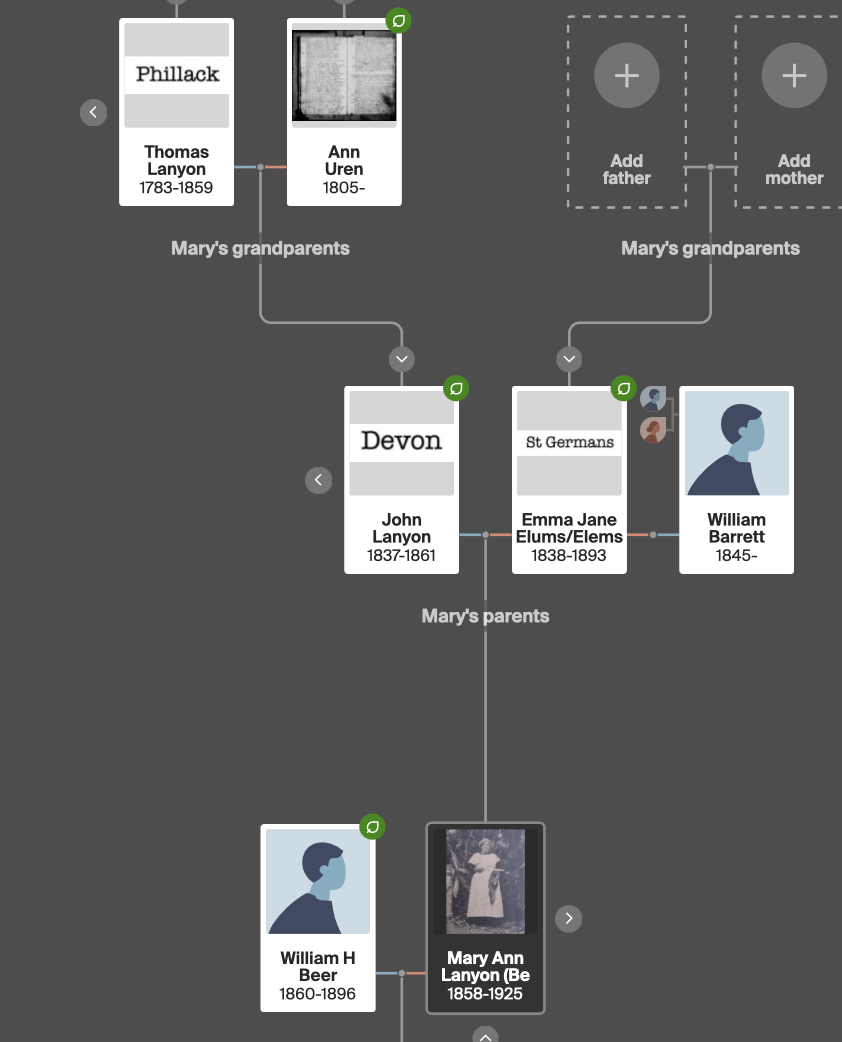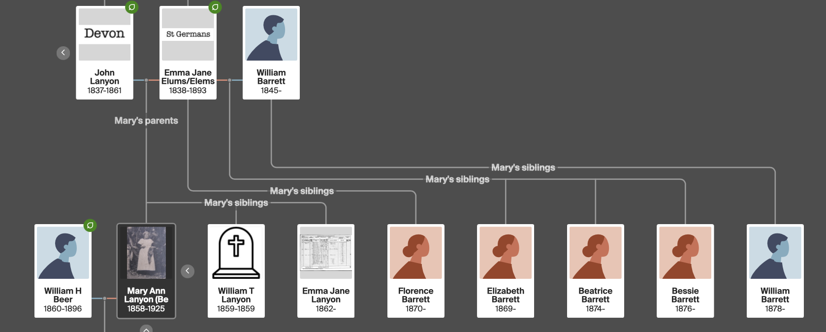 Mary Ann Lanyon was born abt. 1858 at Hayle in Cornwall but I can’t find a record of her birth or her parents’ marriage. Her father was John Lanyon the son of Thomas Lanyon and Ann Uren and her mother was Emma Jane and perhaps her surname was Elems, Elums or Bassett!