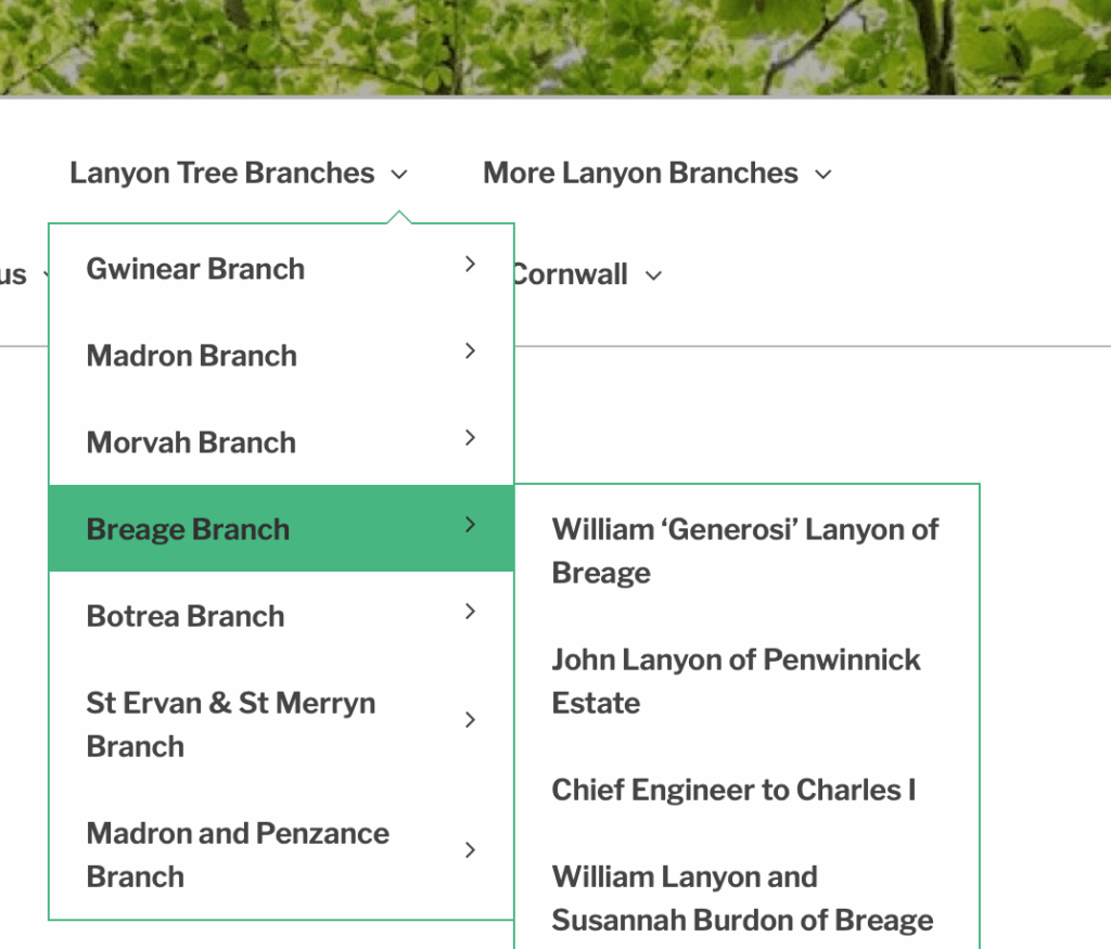 ‘Lanyon Tree Branches’ are the earlier branches of the family whilst ‘More Lanyon Branches’ are the later branches of the family.
