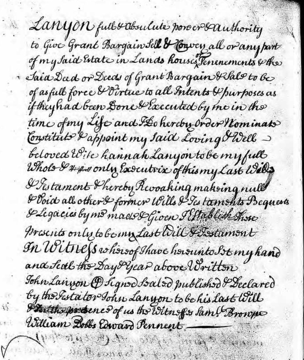 John Lanyon died, probably 1733 and his will was proved 8 Jan 1734.