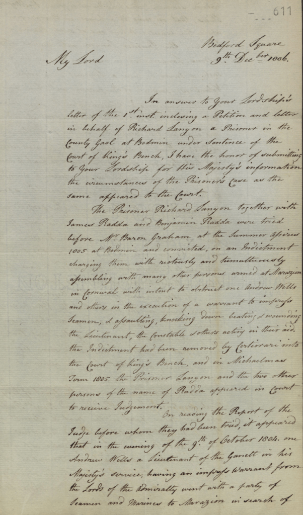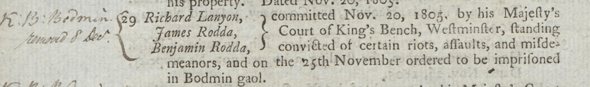 Richard and his nephews James and Benjamin Rodda were arrested and tried before Mr Baron Graham at the summer assizes at Bodmin in 1805. They were convicted on an indictment charging them with “riotously and tumultuously assembling with many other persons armed at Marazion in Cornwall with intent to obstruct one Andrew Wills and others in the execution of a warrant to impress seamen…