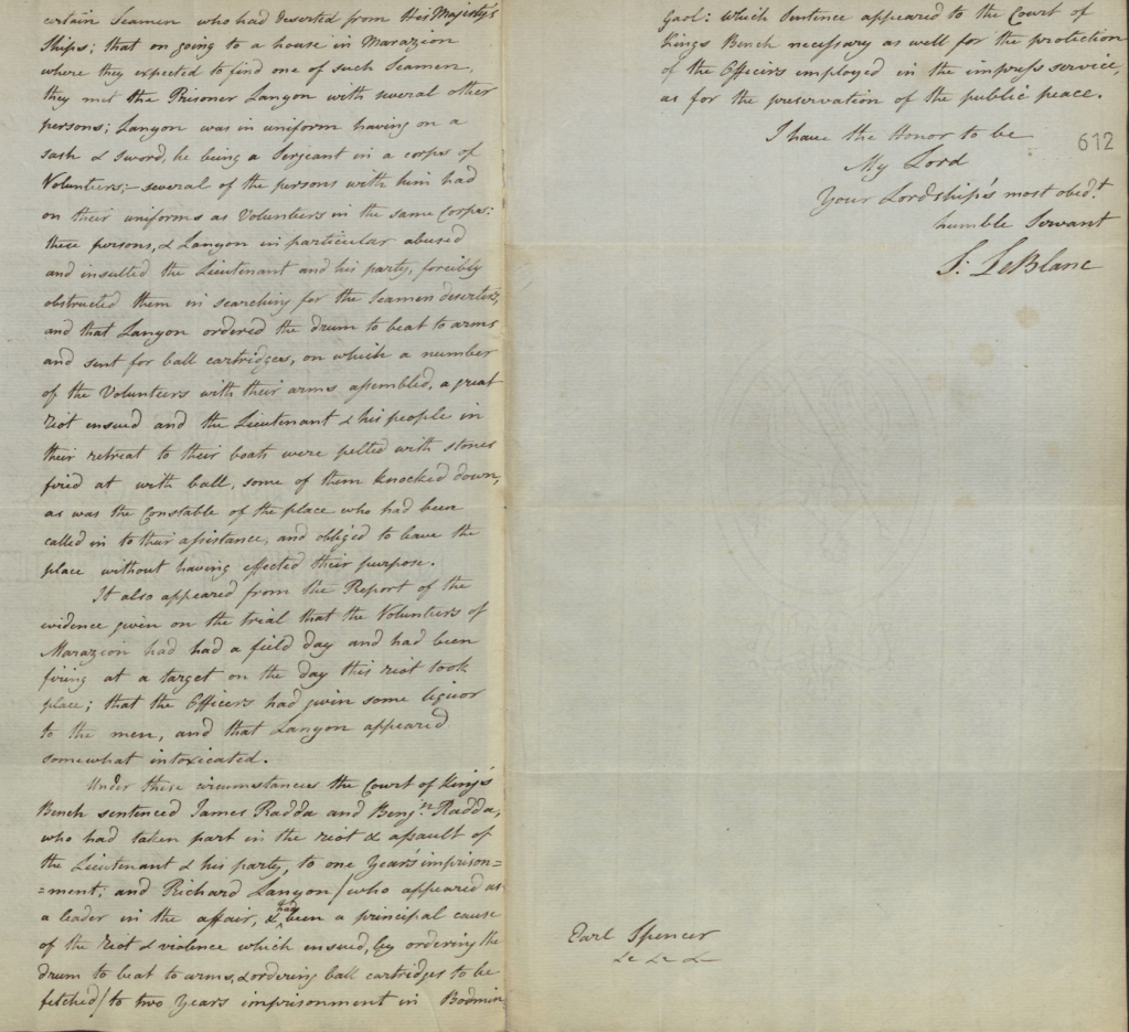 Richard was still wearing his uniform, sash and sword and several of the men with him still had on their volunteer uniforms. Lanyon in particular abused and insulted the lieutenant and his party and obstructed them in searching for the deserters. “Lanyon then ordered the drum to beat to arms and sent for ball cartridges.” A great riot ensued and the lieutenant and his people in their retreat to their boat were pelted with stones, fired at with ‘balls’ and some of them were assaulted.