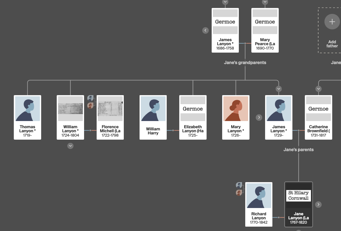 Richard was born in 1770 the youngest son of William Lanyon and Florence Michell. In 1794 he married his cousin Jane Lanyon (the daughter of James Lanyon and Catherine Brownfield) at St Hilary in Cornwall. (See St Hilary branch of the Lanyon tree.)