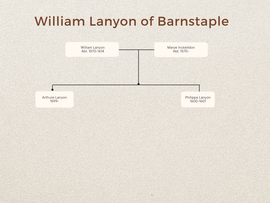 William Lanyon was born about 1570 but I don’t know where or how he fits onto the Lanyon tree. He first appears in Barnstaple’s parish registers on 2 Feb 1596 when he married Marye Inckelldon. Marye was from an old established Devon family, the Incledons/Inckelldons of Braunton. They are listed in the Herald’s Visitations of Devon and the family can trace its roots to the 12th century. Sadly there was no trace of Marye on the Incledon tree.