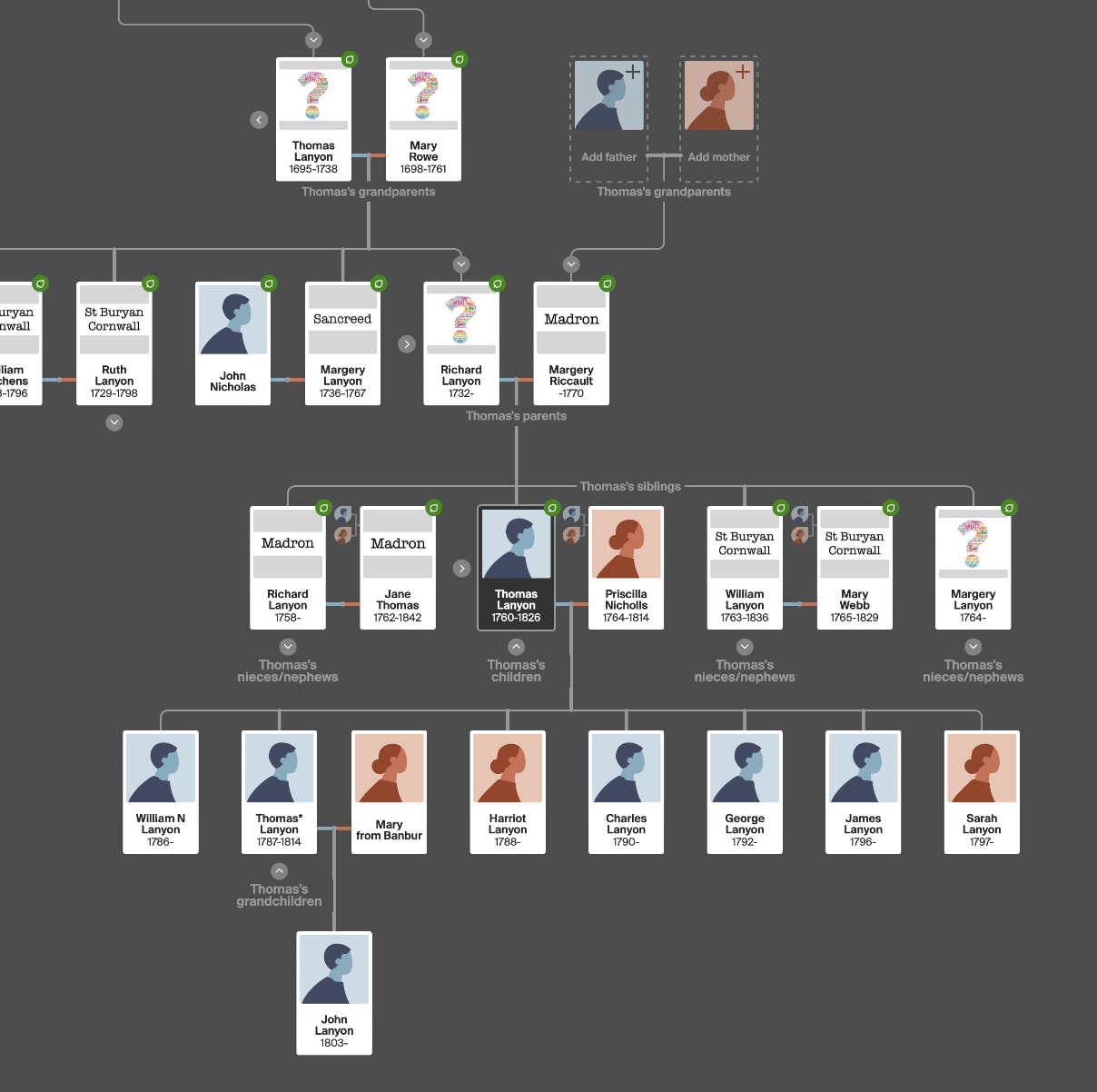 Where did Thomas Lanyon senior come from? After quite a search there was just one Thomas who seemed to fit the bill. Thomas baptised 13 July 1760 at Madron, the son of Richard Lanyon and Margery Riccault.