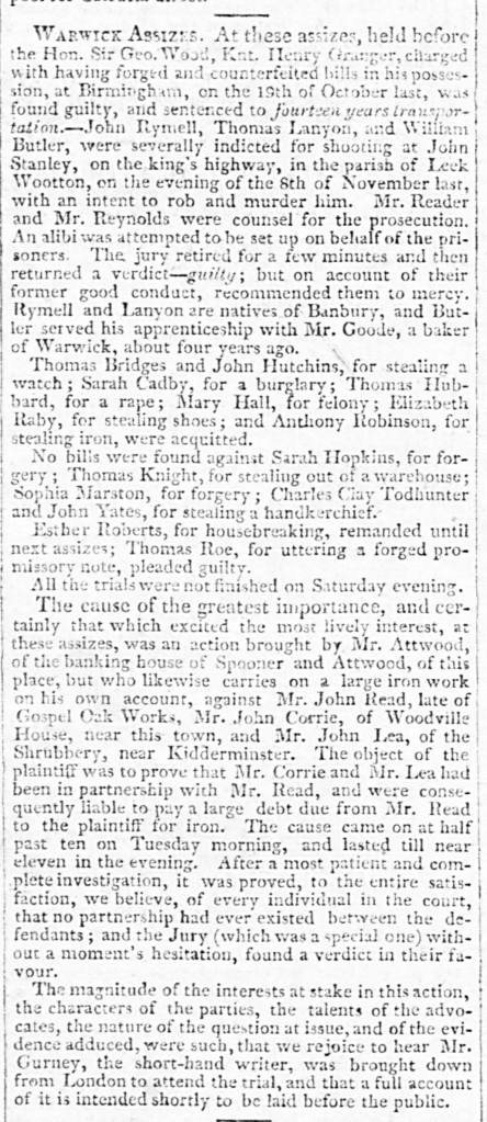 In 1814 Thomas Lanyon, William Butler and John Rymell were convicted at Warwick Assizes of shooting at Mr J Stanley with intent to kill on the highway at Leek Wootton, just outside Warwick.