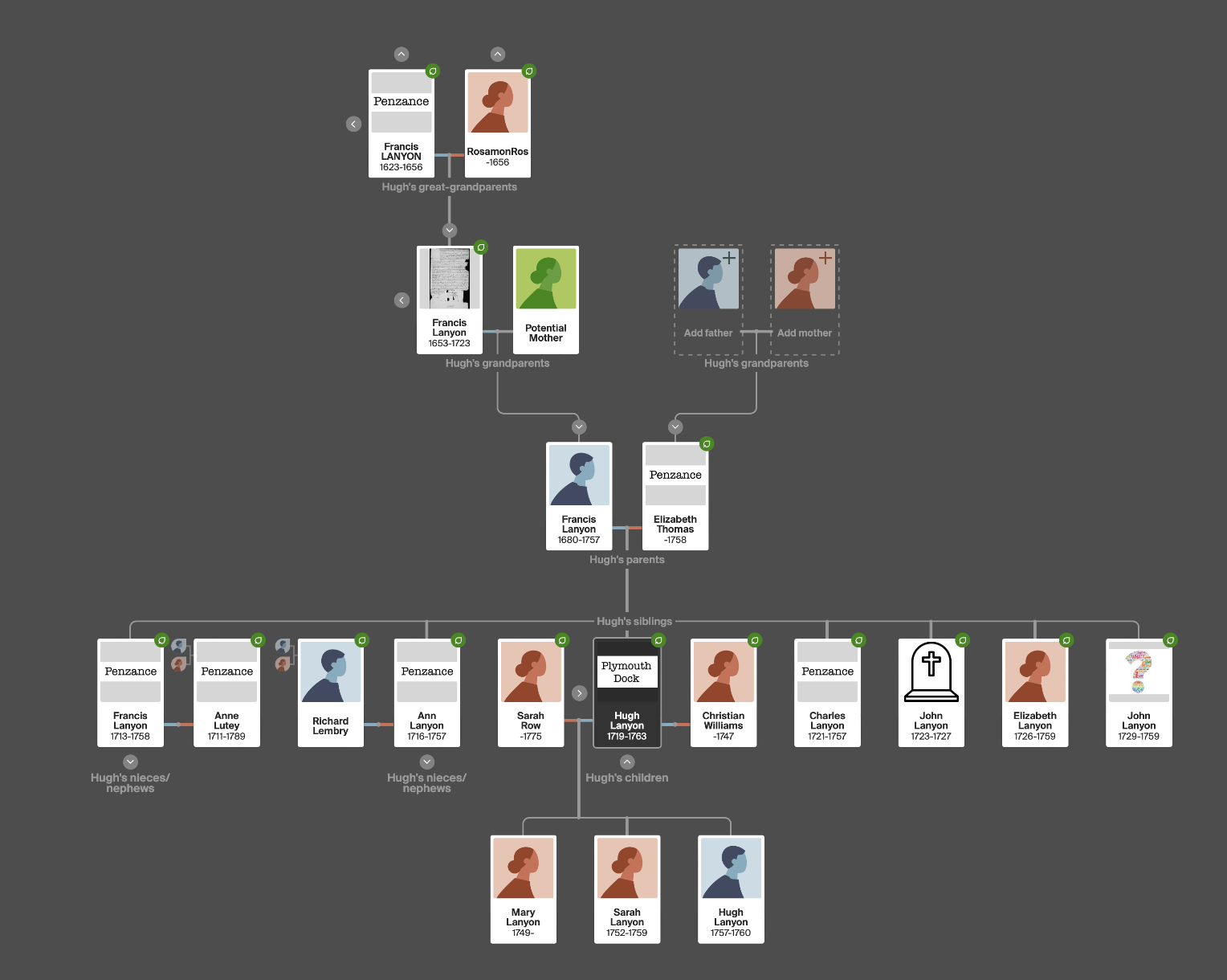 Hugh Lanyon was baptised on 22 May 1719 at Madron, Cornwall, the son of Francis Lanyon and Elizabeth Thomas. Francis died in 1757 and his 1759 will mentions that son Hugh was now living at Plymouth Dock.