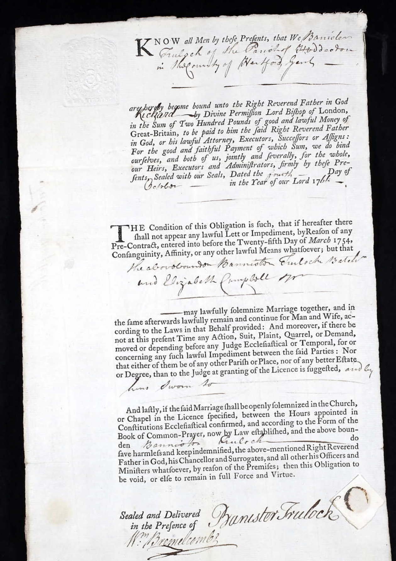 Banister was born about 1734 in East Grinstead. He married Elizabeth Campbell 05 Oct 1766 at Broxbourne, Hertfordshire. He signed a marriage bond.